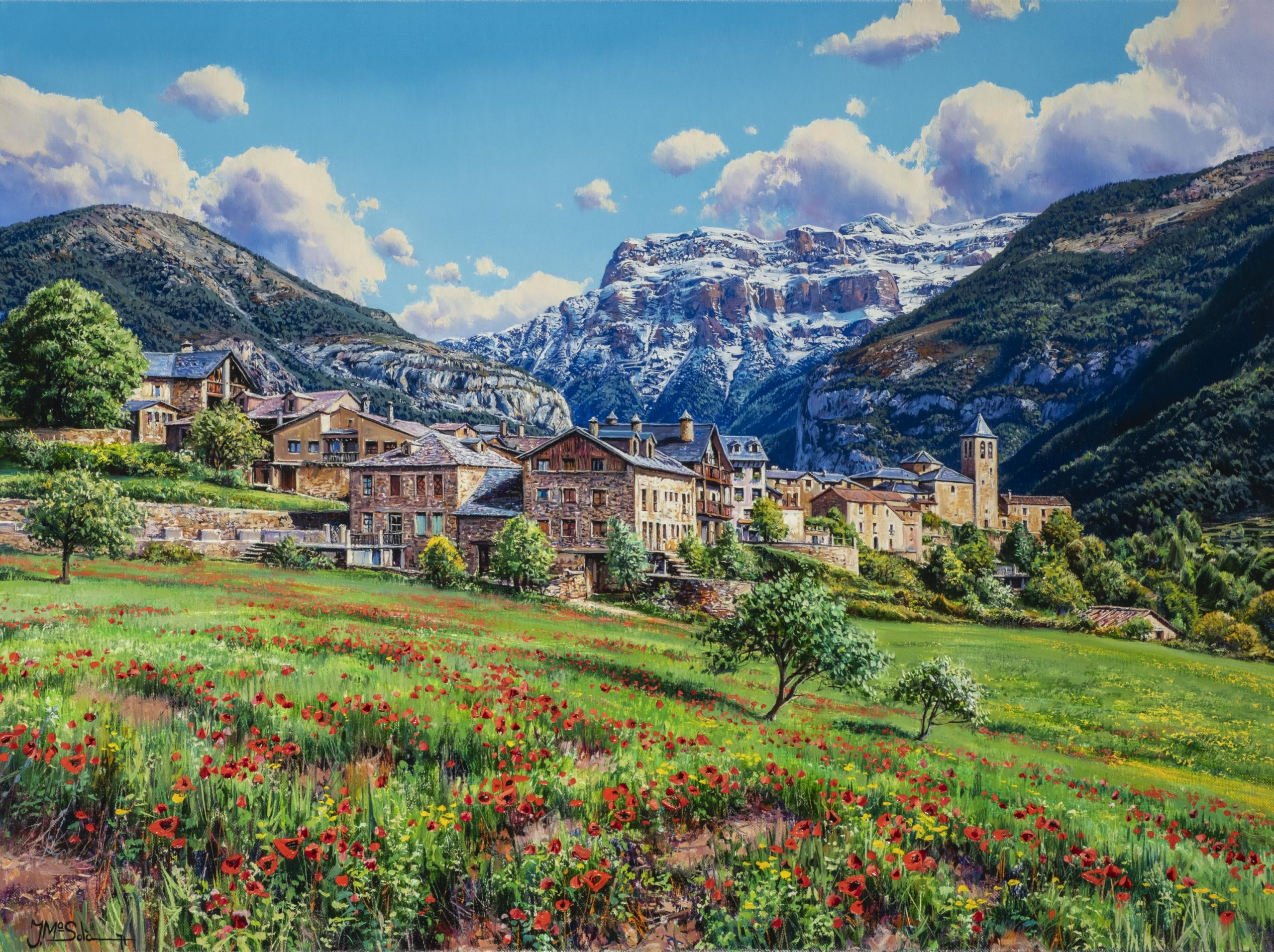 Josep M°Solà , en efecte, se sent arrelat a un paisatgisme que coneix molt bé, i que oscil.la entre l’efecte d’un realisme barbizonista i la d’un impressionisme mediterrani, i sap conjugar-ne els elements amb sensible habilitat và lida per la plasmació d’uns racons amables o unes panorà miques de camps sucosament interpretats.